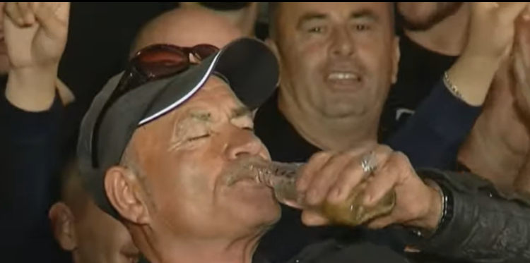 Nuk do ta zgjas shumë, do më falni se kam një dolli për doktor Berishën. E mbante babai im në çantë. Doktor, një dolli për ty se nuk je vetëm politikan shembullor, je burrë shembullor dhe do ta pi këtë dolli për ty, për fëmijët e tu, për princeshën tënde se e di që burrat nuk mbajnë facoletë, por shami. Për ty doktor Berisha.