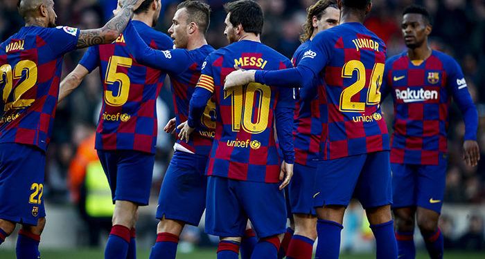 BARCELONA, SPAIN – FEBRUARY 22: (L-R) Arturo Vidal of FC Barcelona, Sergio Busquets of FC Barcelona, Arthur of FC Barcelona, Lionel Messi of FC Barcelona, Junior Firpo of FC Barcelona celebrates goal 3-0 during the La Liga Santander match between FC Barcelona v Eibar at the Camp Nou on February 22, 2020 in Barcelona Spain (Photo by David S. Bustamante/Soccrates/Getty Images)