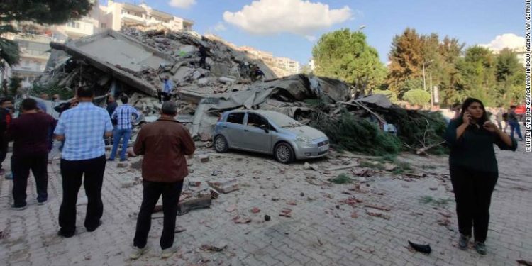 Të paktën gjashtë ndërtesa janë shkatërruar në qytetet turke të Izmirit, Bornovas dhe Bayraklit pas tërmetit me magnitudë 7.0 ballë që tronditi detin Egje këtë të premte. Ministri i Brendshëm Turk Suleyman Soylu tha se ekipet e shpëtimit janë duke kryer shqyrtime dhe ndërhyrje në terren. Nga raportimet e mediave greke një kishë është shembur ndërsa pamjet e trasmetuara tregojnë qytetarët që u derdhën në rrugë të tmerruar sapo toka filloi të dridhej.