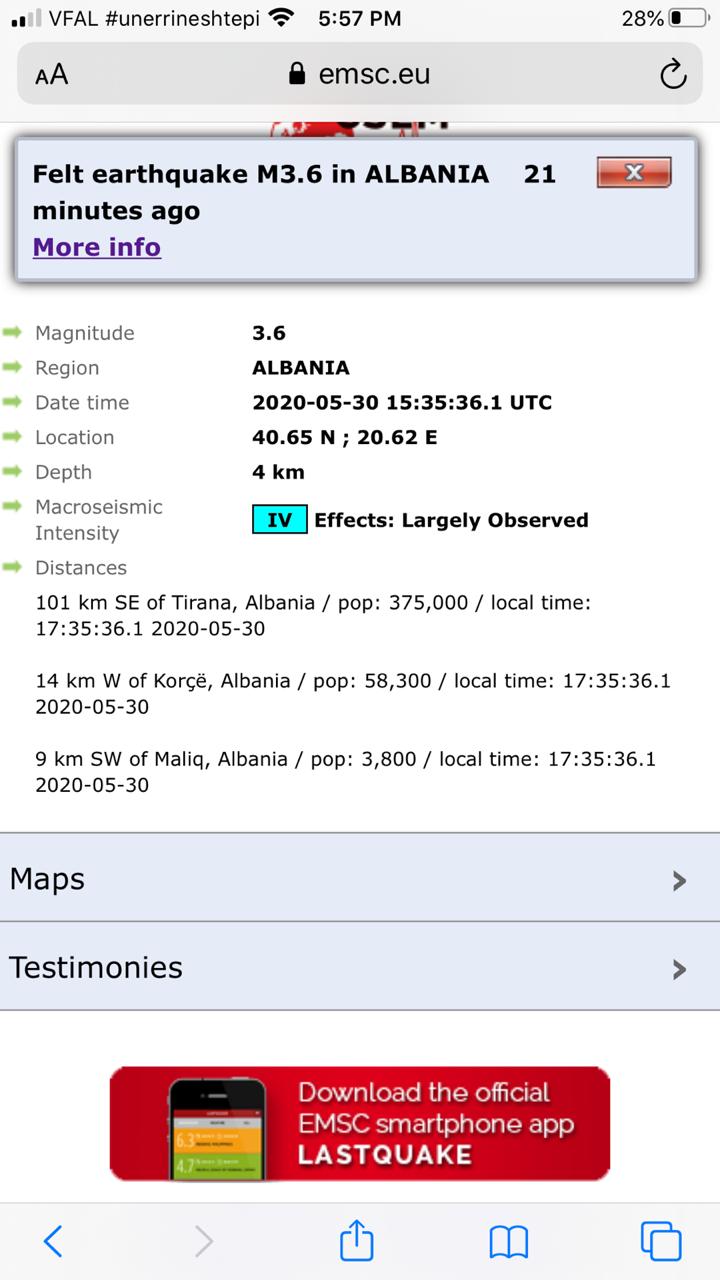 Një tërmet me magnitudë 3.6 dhe me thellësi 4 km ka goditur vendin tonë. Sipas EMSC epiqendra ishte në Korcë, ndërsa deri tani nuk raportohet për të lënduar.